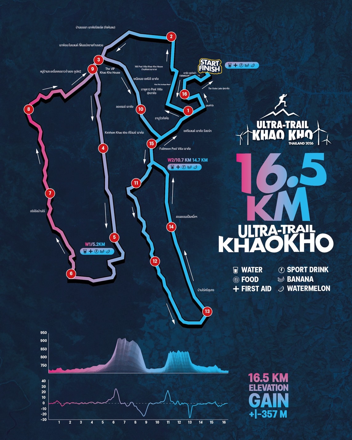 - 16.5 KM Cutoff 5 ชม. แนะนำอุปกรณ์ใส่น้ำมีจุดให้น้ำทุก 5 กม. (Elevation +|-357 m)